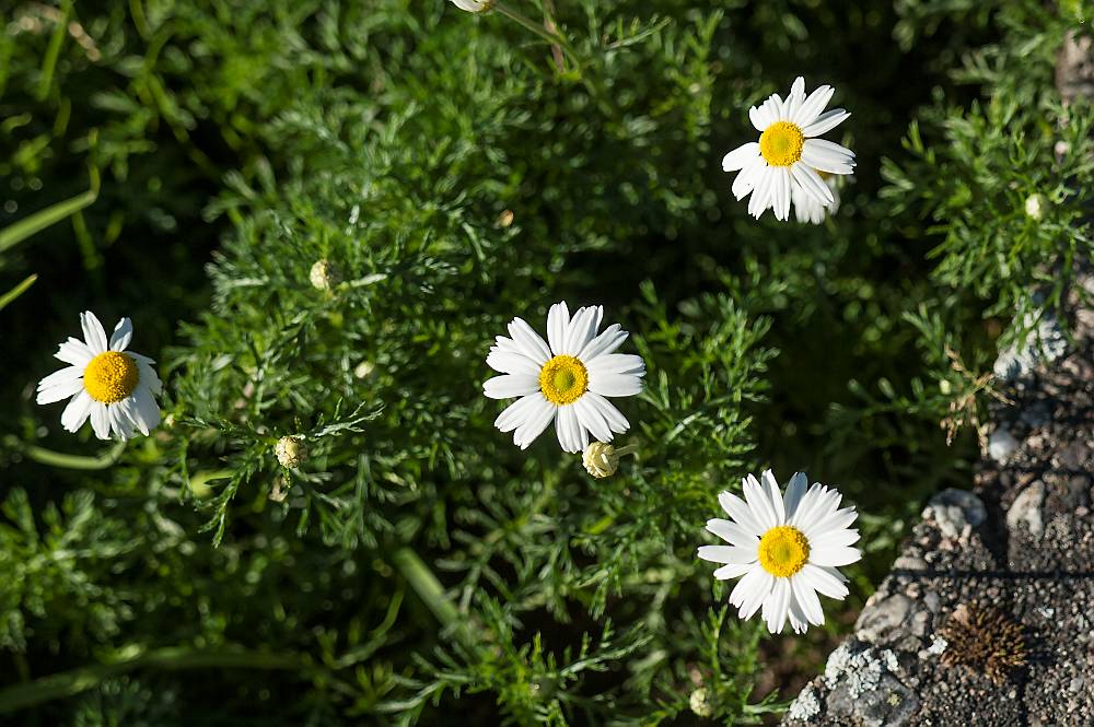 Planten har mange blomsterkorger, 1,5-3 cm i diameter, men enslige i enden av greinene. Kantblomstene er hunlige med tungeformete, hvite kroner. Midtblomstene er tvekjønnet med rørformete, gule kroner. Blomstring fra vår til høst.