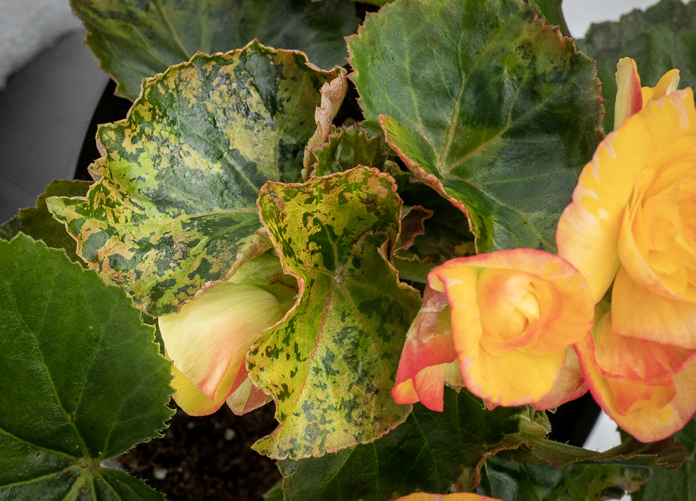 Mosaikk i begonia forårsaket av INSV. (Foto: D-.R. Blystad, NIBIO)