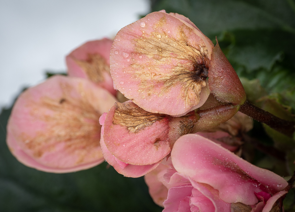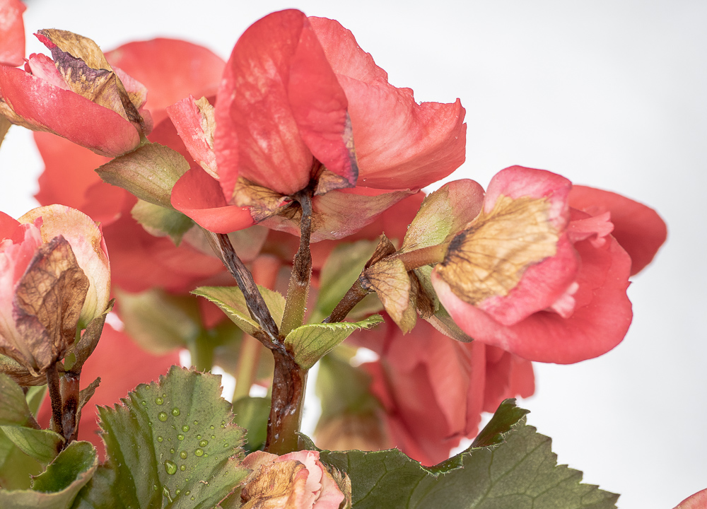 Begoniablomster med dødt vev forårsaket av INSV. (Foto:D-.R. Blystad, NIBIO)