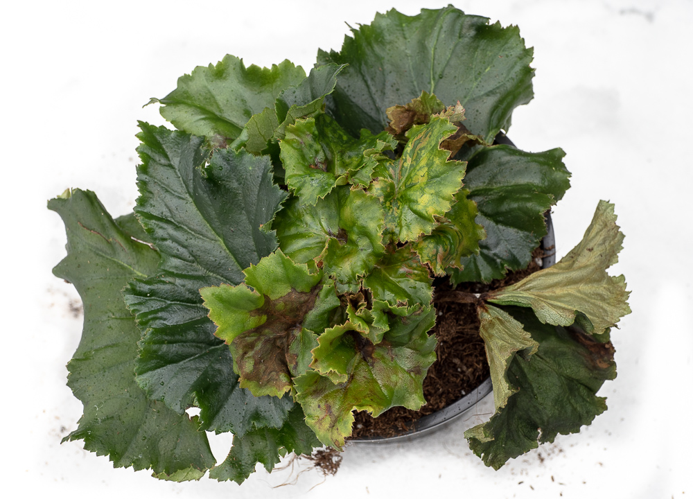 Begonia med nekroser, ringflekker og mosaikk forårsaket av INSV. (Foto: D-.R. Blystad, NIBIO)