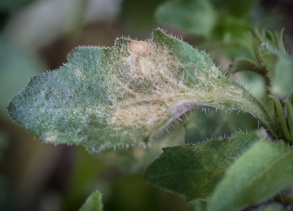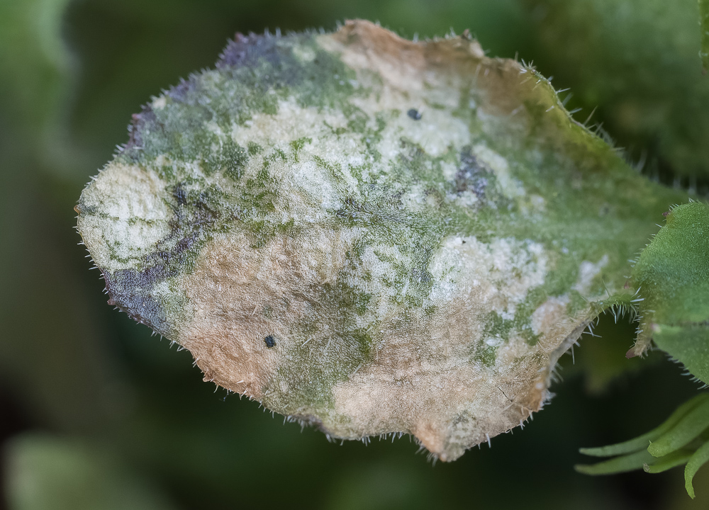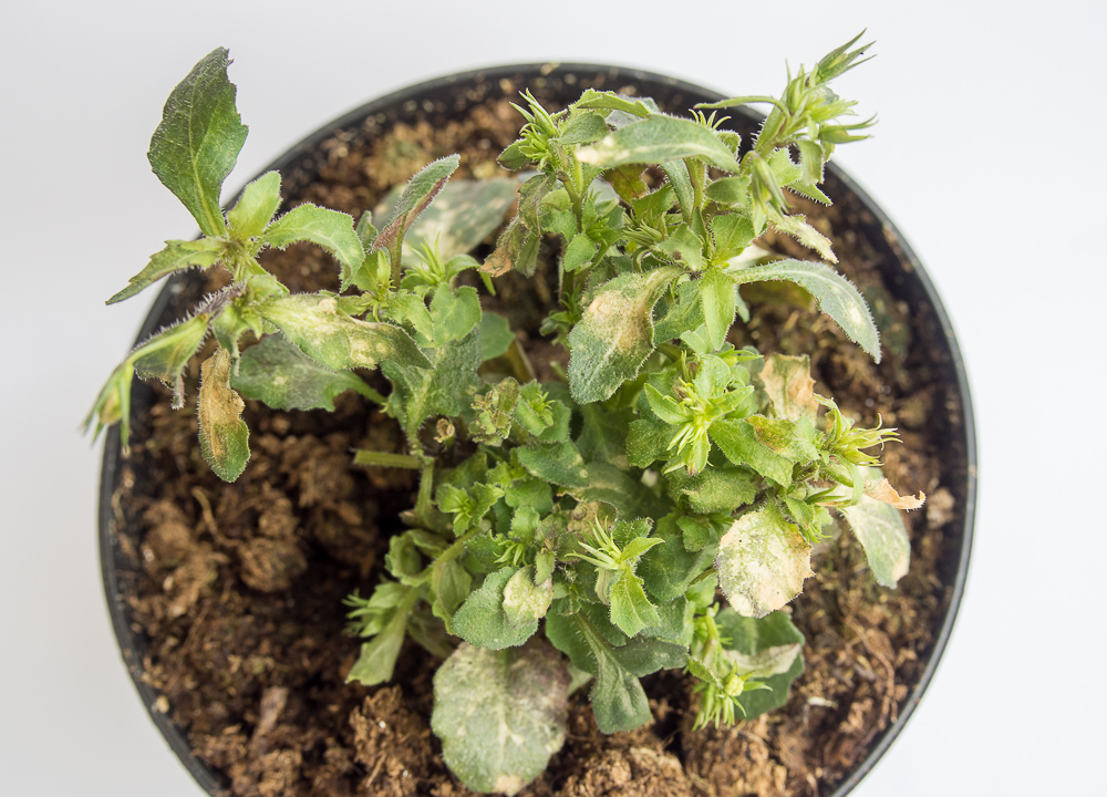 Lobelia infisert av INSV - sølvaktige og brune bladflekker og vi (Foto: D-.R. Blystad, NIBIO)